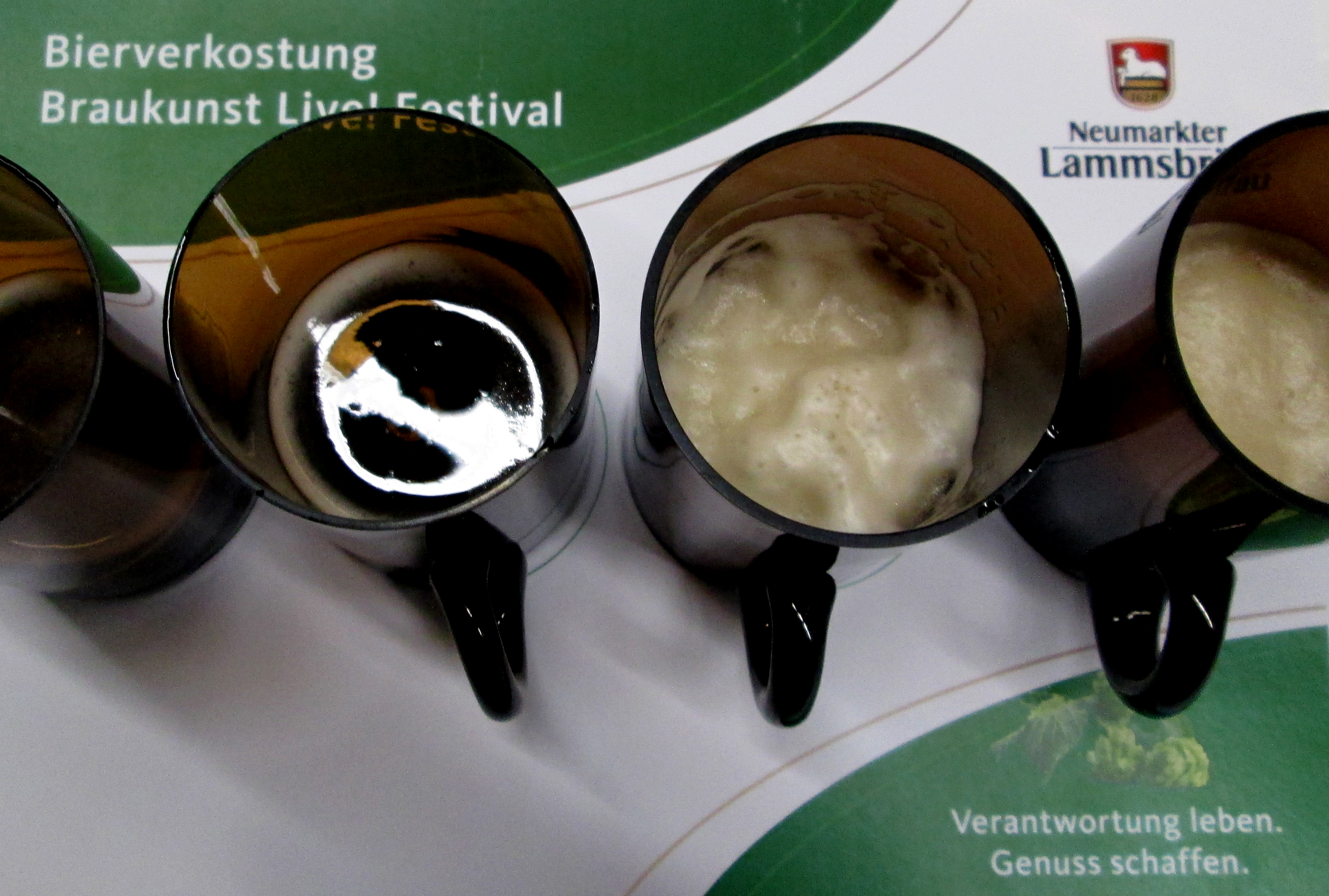 Die Gruppe tingelt weiter zu einem Vortrag. Währenddessen suche ich verzweifelt den Raum, wo in ein paar Minuten der Bier-Sommelier-Crash-Kurs von Neumarkter Lammsbräu anfängt. Wer fragt, der führt. Ich habe es gefunden. Zu Beginn begrüßt die Chefin Susanne Horn die Gäste, dann verrät Biersommelier Heinz Kühnlein, auf was beim Bier zu achten ist. Klar: Farbe, Geruch und Geschmack. Wie bei gutem Wein. In dem relativ kleinen Raum, in dem eine große Ansammlung von Festival-Gläsern stehen, probieren wir Lammsbräu Pils, helles Weißbier, ein Dunkles und den 1628 Weizen-Bock. Aromen von Banane, Aprikose, Karamell und Kaffee bringen einige Teilnehmer des Crash-Kurses in höchste Verzückung. Unkundige Teilnehmer können es kaum fassen, was Bier für Aromen freisetzen kann. Zum Abschluss gibt es eine Blindverkostung. Dunkle Gläser, damit niemand die Farbe des Bieres sehen kann. Man soll erkennen, ob es sich um unter- oder obergärig, Zitrus- oder Schokoladengeschmack oder sogar um ein Alkoholfreies handelt. Bis auf ein Bier liege ich in allen Punkten richtig. Nur beim Alkoholfreien hatte ich versagt.