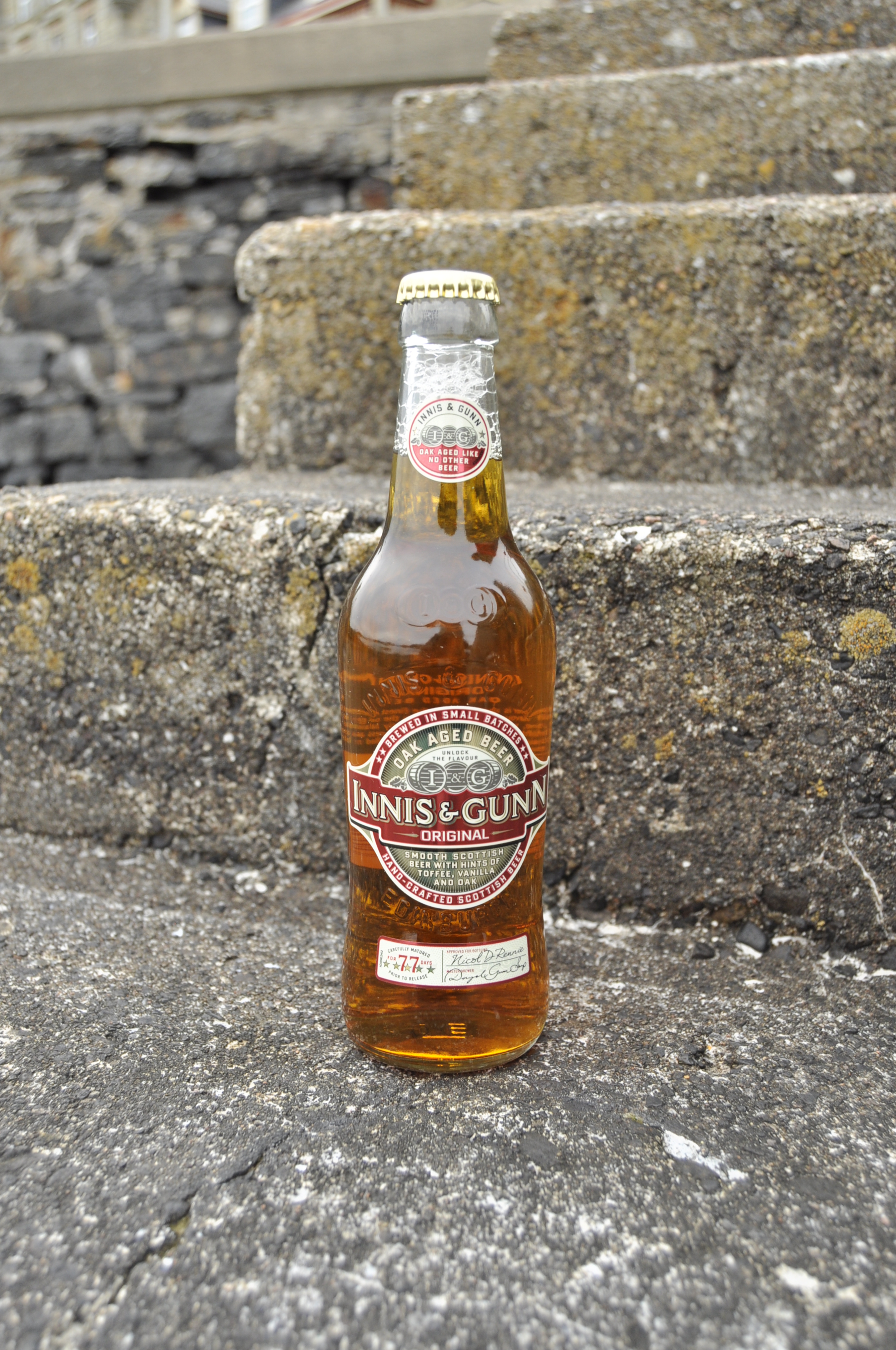 Nach einem aufregenden Tag auf der Isle of Sky im Westen Schottlands, war die Hafenstadt Portree unser Ziel für den Abend. In einem kleinen Restaurant aßen wir Fisch mit Pommes, dazu ein Guinness. Die Bierkarte war leider sehr enttäuschend. Um den Abend aber doch noch gemütlich ausklingen zu lassen, entschieden wir uns für ein Innis & Gunn Oak Aged mit über sechs Prozent Alkoholgehalt auf einer Treppe die ins Meer führt.