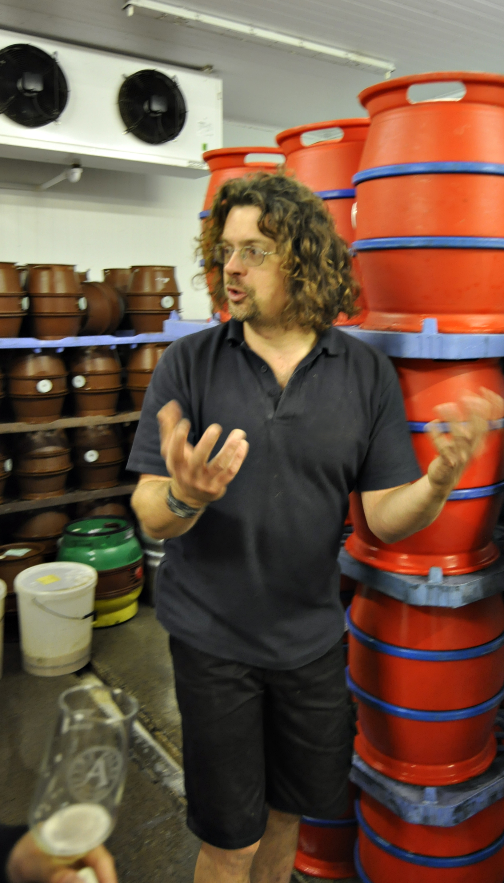 Chris Brooks, ein kräftiger Schotte mit wallender Mähne, war überrascht, dass eine deutsche Bierbloggerin den Weg in das abgelegene schottische Tal fand. Und so nahm er sich Zeit für eine Führung durch alle Stationen des Brauprozesses einschließlich diverser Kostproben seiner Kreationen. Seit 2012 ist er für das Bier verantwortlich. Er führte uns in sein Terrain. Die Räumlichkeiten erinnerten noch stark an den ehemaligen landwirtschaftlichen Betrieb. Hohe Wände tragen ein altes Holzdach, eine hölzerne Treppe ragt hinauf in einen Speicher. Drei kleine Tanks standen im ersten Raum. In den einen Kessel rauschte von oben durch ein Rohr, das aussah wie eine Regenrinne, gerade das Malz. Es duftete stark nach Maische. Im Kessel brodelte es. Brooks zog einen Sack voll mit amerikanischer Cascade-Hopfen hervor und sagte: „Dieser Stoff hier ist die wichtigste Zutat für einen Craft-Brauer, darauf stehe ich total.“ Aber Cascade sei nur eine Facette seiner Kreationen. „Inzwischen kaufen wir Hopfensorten aus der ganzen Welt, vor allem aber aus Deutschland, USA, Neuseeland und Australien.“