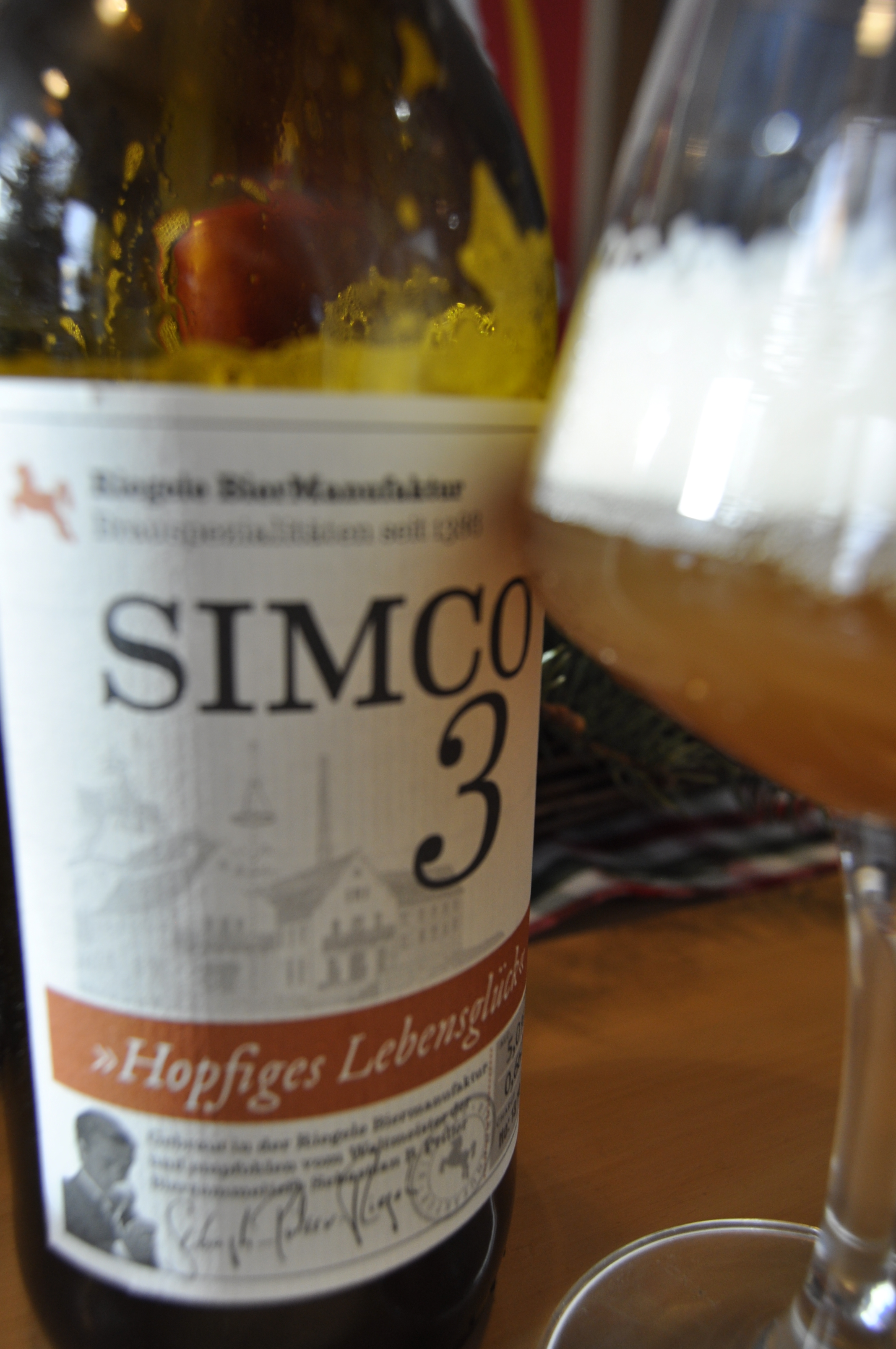 So, ich habe mich entschieden: Simco 3 soll das Erste sein. Ein India Pale Ale, das mit einem markigen Slogan als „Hopfiges Lebensglück“ bezeichnet wird. Die „3“ steht für den Hopfendreiklang aus amerikanischer Simcoe, deutschem Hallertauer Perle und Opal. Das klingt doch schon einmal spannend, oder? Ab ins Glas: das IPA besticht durch seine kupferne Farbe auf der eine kräftige Schaumkrone prunkt. Der Geruch? Wow! Sehr hopfig mit Aromen von Holunder, Aprikose, Pfirsich und Mango. Außerdem bringt wohl die selbstgezüchtete obergärige Ale Hefe eine bananige Note dazu.