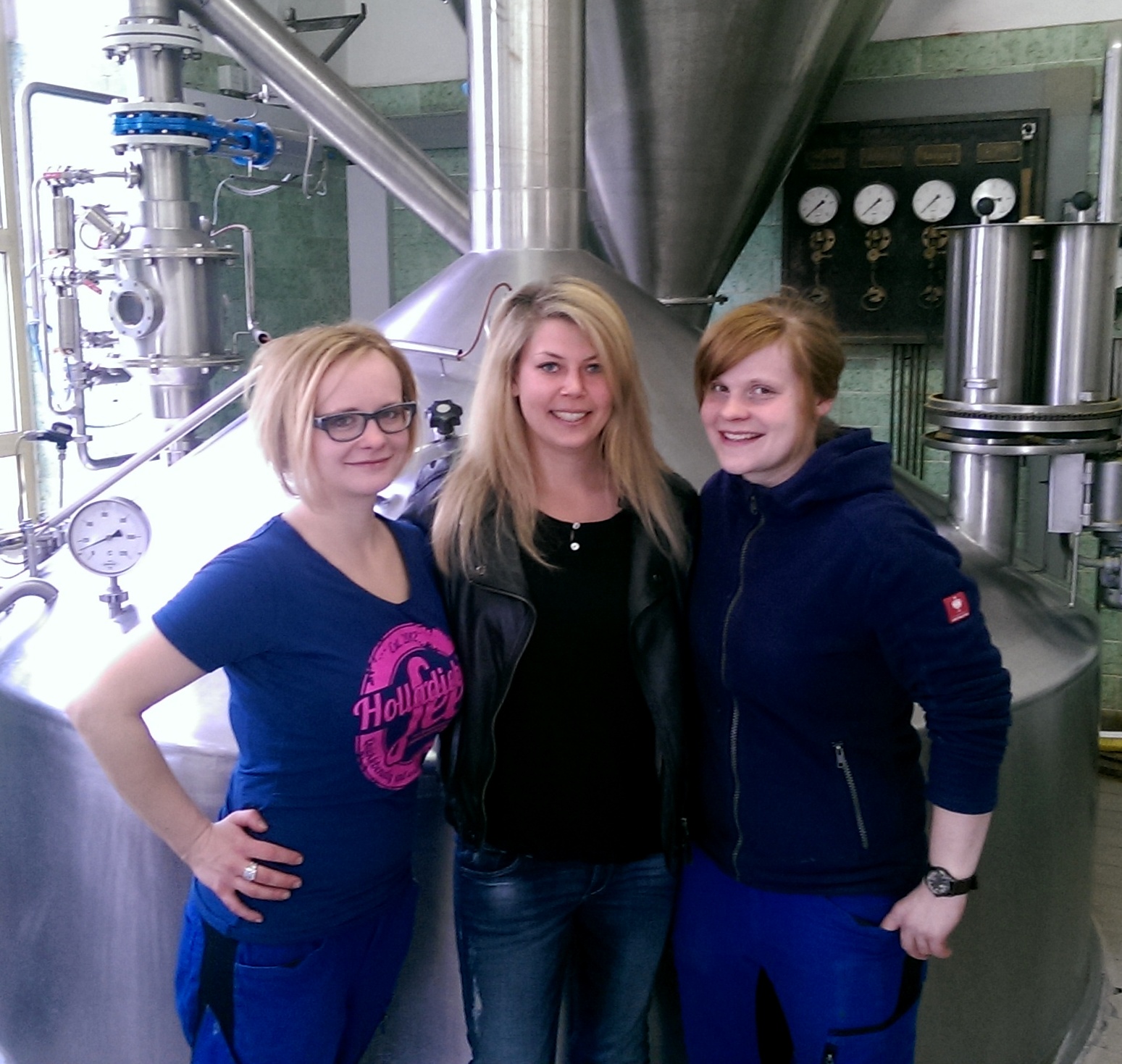 Gestern besuchte Gisi und Moni – ein Teil der Macher von dem Frauenbier „HolladieBierfee“ – vom Meinel Bräu im oberfränkischen Hof. Die beiden Schwestern empfingen mich freundlich und fröhlich mit schwerem oberfränkischem Dialekt. Freitags ist Reinigungstag in der Braustätte, die in einem alten Backsteinhaus inmitten des Stadtgebietes liegt. Die Sudkessel waren leer und der Geräuschpegel ziemlich hoch. Kaum eine Möglichkeit um sich zu unterhalten. Deswegen gingen wir eine steile Wendeltreppe hinab in den ruhigen Lagerkeller. Hier steht der Tank mit der Sommerbierfee, ein Starkbier, das wohl erst nach Ostern präsentiert werden soll. Es roch noch nach amerikanischem Calypso-Hopfen, der a m Vortag in das Bier gestopft wurde.