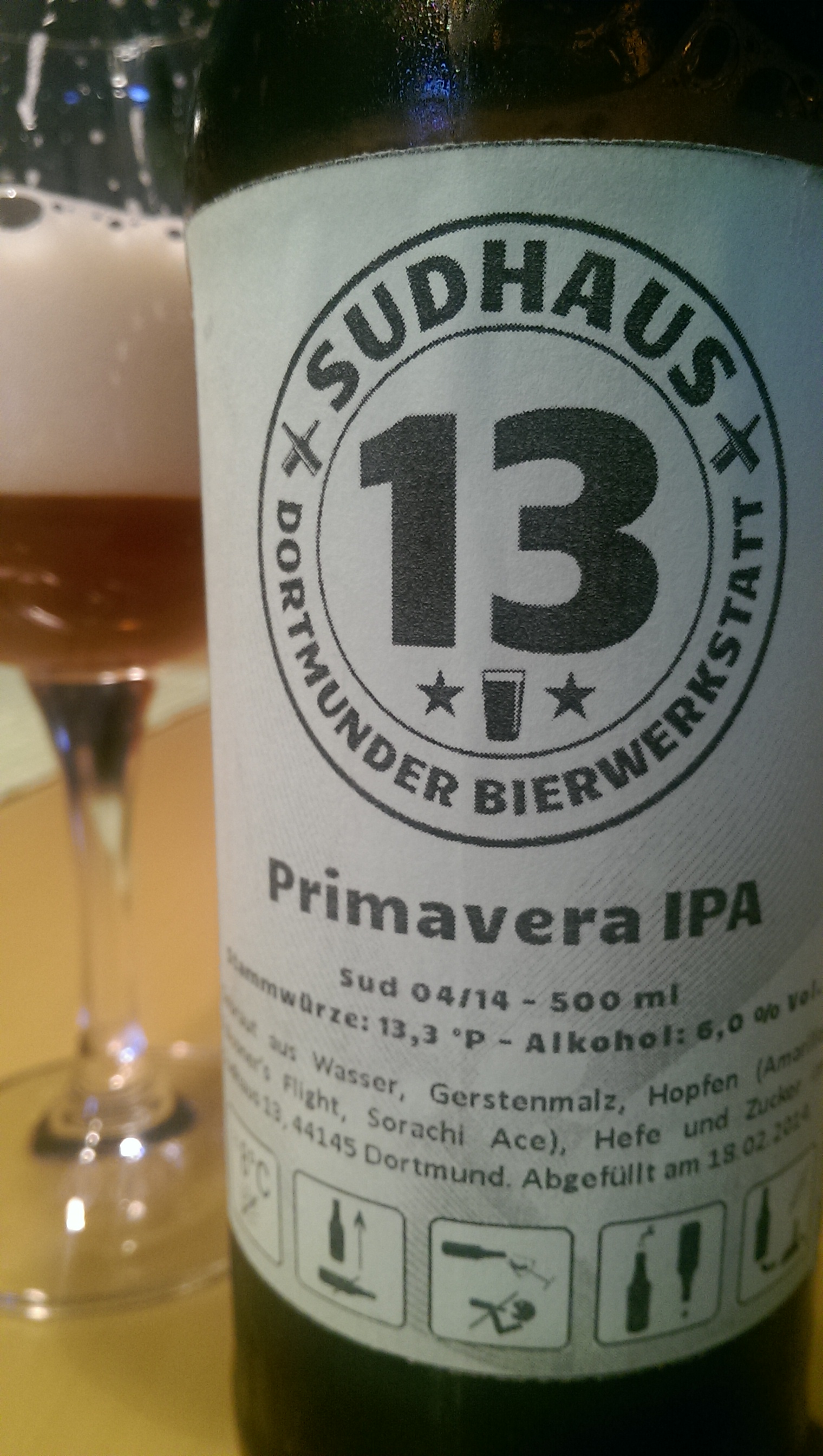 Seit 2013 braut Ferdinand Laudage in Dortmund unter seiner Marke Sudhaus 13 (das ist auch seine Hausnummer) besondere Craft-Biere –meist für seinen ganz individuellen Genuss – in einem 25 Liter fassenden Einkocher. Er selbst sagt: „Brauen macht süchtig!“ Angefangen hatte er mit handelsüblichen Braukits, aber mittlerweile bezeichnet er sich als echter Maischebrauer. Ich durfte schon einige der Kreationen von Ferdinand probieren und war bei fast jeden Tropfen begeistert. Das Primavera IPA fand ich so ungewöhnlich im Geschmack, dass ich es euch jetzt unbedingt vorstellen möchte. Es hat sechs Prozent Alkoholgehalt, 13,3° Stammwürze und drei verschiedene Hopfensorten: Amarillo, Falconers Flight und ist gestopft mit Sorachi Ace.