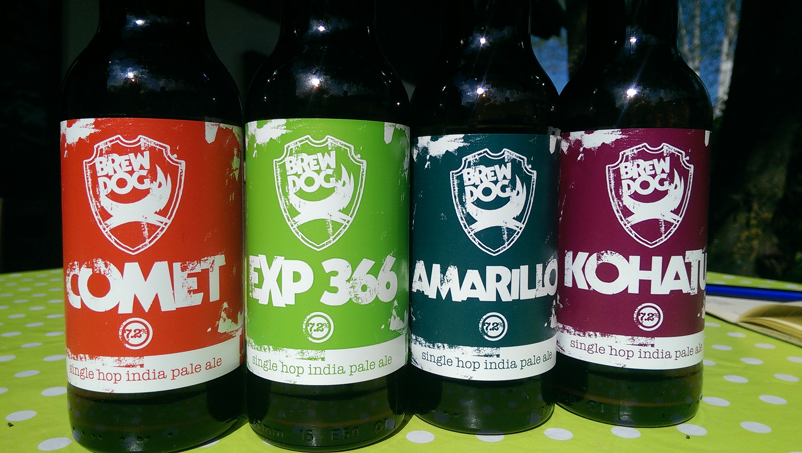 Am Wochenende verkostete ich mit meiner Schwester die „IPA is Dead“-Serie von der schottischen Brauerei Brewdog. Dabei ging es um vier Single Hop Biere, die alle mit dem gleichen Malz und der gleichen Hefe gebraut, aber jeweils mit einem anderen Hopfen gestopft wurden: amerikanischer Amarillo, deutscher Comet, neuseeländischer Kohatu und amerikanischer Exp 366. Die Kreationen in dem Viererpack unterscheiden sich weder in der Stammwürze (15,5 Prozent), noch im Alkoholgehalt (7,2 Prozent) und auch nicht in der Bittere (70 IBU). Diese vier IPAs sind ein wunderbares Beispiel, wie intensiv Hopfen als Geschmacksträger dient.