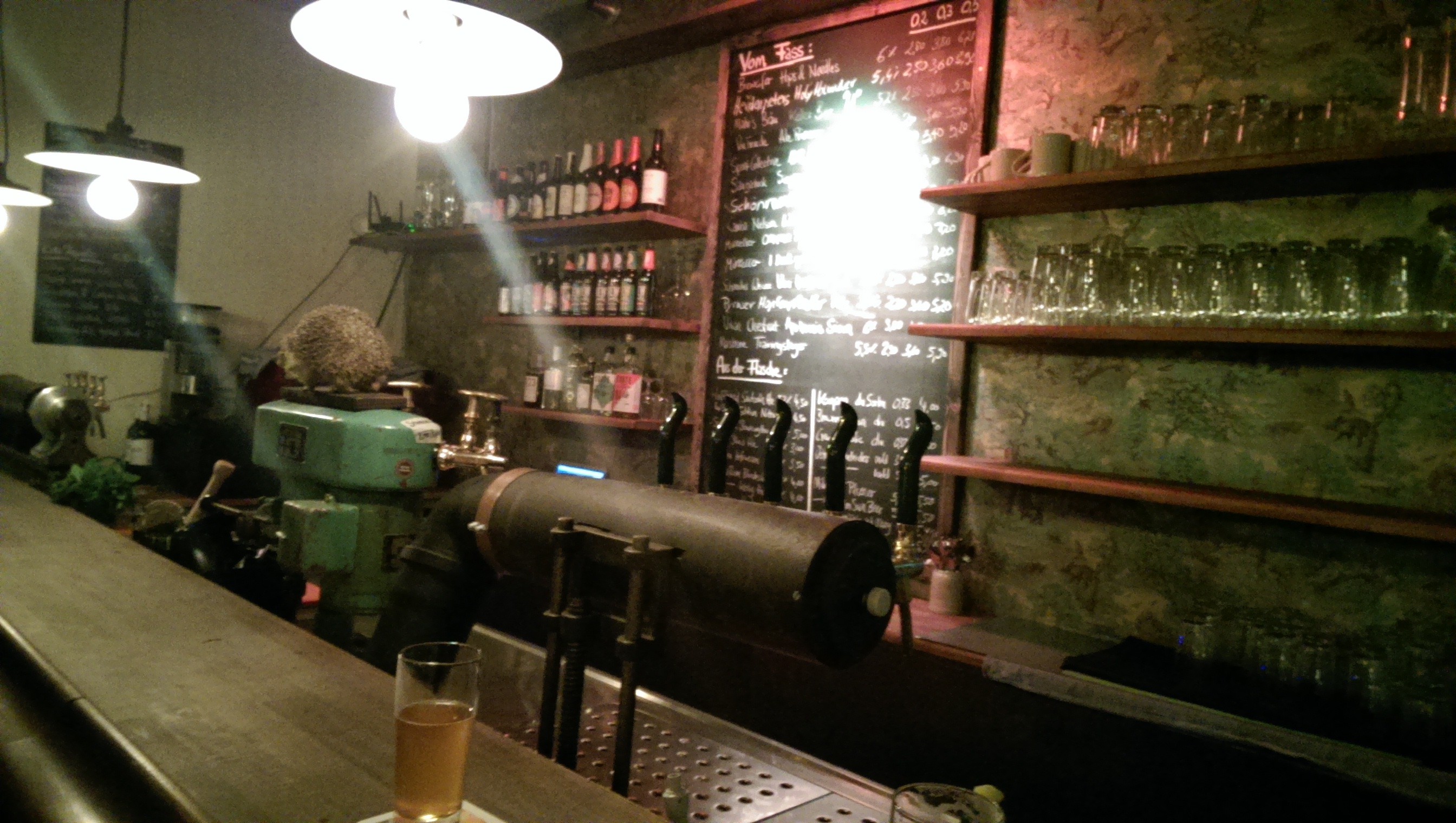 Nein, das Hopfenreich ist keine hypercoole Nerd-Bar. Mit seinen rustikalen Holzverkleidungen, den Kronleuchtern aus Bierflaschen und den aus historischen Industriewerkzeugen gefertigten Zapfanlagen erinnert die Atmosphäre eher an eine gemütliche Kreuzberger Kneipe aus guter alter Zeit. Aber die Musik ist nicht von Gestern: Durch gedämpftes Licht kämpfen sich fetzige Rocksongs eher zart aus den Boxen. Passend zum Sound werden die Biere quasi aus einer ausrangierten Bohrmaschine eingeschenkt. Hat was! Sogar Tierfreunde kommen auf ihre Kosten: Hoch oben auf der Craft-Quelle thront ein ausgestopfter Igel, der wohl als Maskottchen dient.