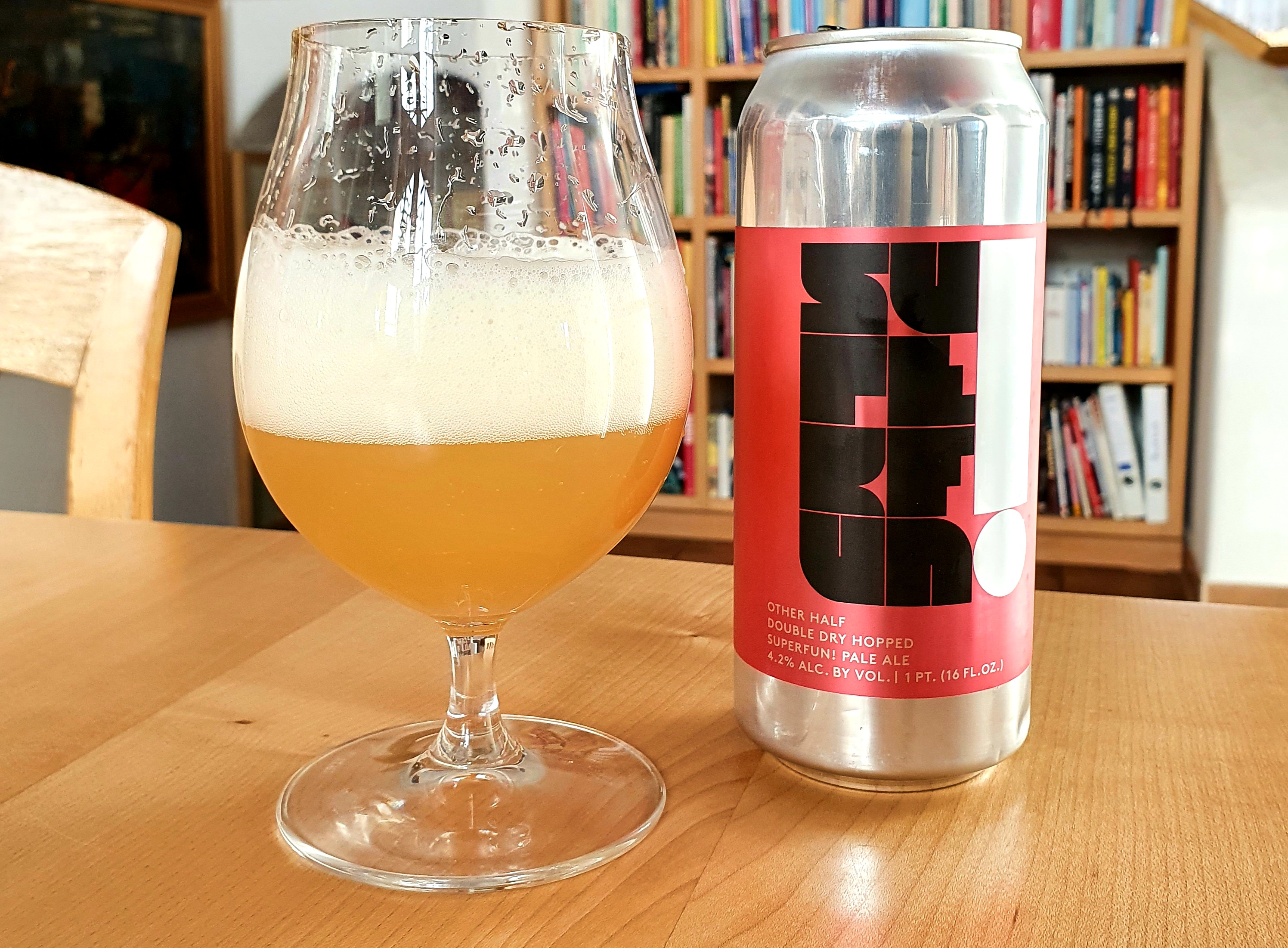 Die Sude aus der Craft-Stätte Other Half aus Brooklyn gelten derzeit als besonders heißer Stoff. Hierzulande kommt man echt nur schwer an diese Biere. So musste ich im niederländischen Onlineshop „Beerrepublic“ zuschlagen, als es dort frische Ware gab. Zugegeben habe ich zweimal überlegt, wie viele Dosen ich bestellen soll. Der Preis beginnt bei 9,99 Euro. So auch beim 4,2-prozentige Double Dry Hopped Pale Ale namens „Superfun!“. Vor allem die Hopfenkombination mit Galaxy, El Dorado und Simcoe hatte mich zum Kauf angeregt.