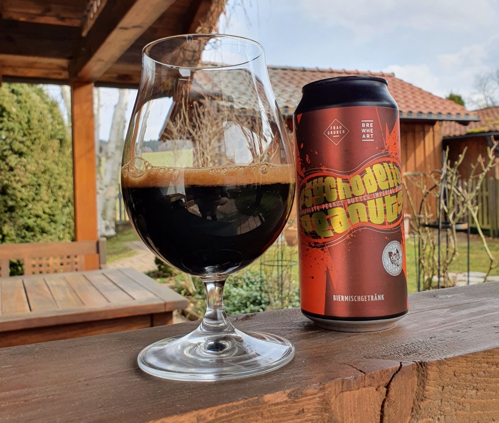Erdnussbutter mag ich in Reinform eigentlich überhaupt nicht. Im Bier dafür seltsamerweise aber umso mehr. So war ich schon voller Vorfreude, als ich las, dass Frau Gruber und Brewheart gemeinsam ein Chocolate Peanut Butter Imperial Stout rausbringen. Der nachtschwarze Sud heißt „Psychodelic Peanuts“ und legt ordentliche 10,8 Umdrehungen vor. Gebraut ist das Bier mit 25 Prozent Erdnussbutter und Kakaobohnenbruch – also ohne jegliche Zusatzstoffe, die sonst gern mal in Peanut Butter-Sorten stecken.