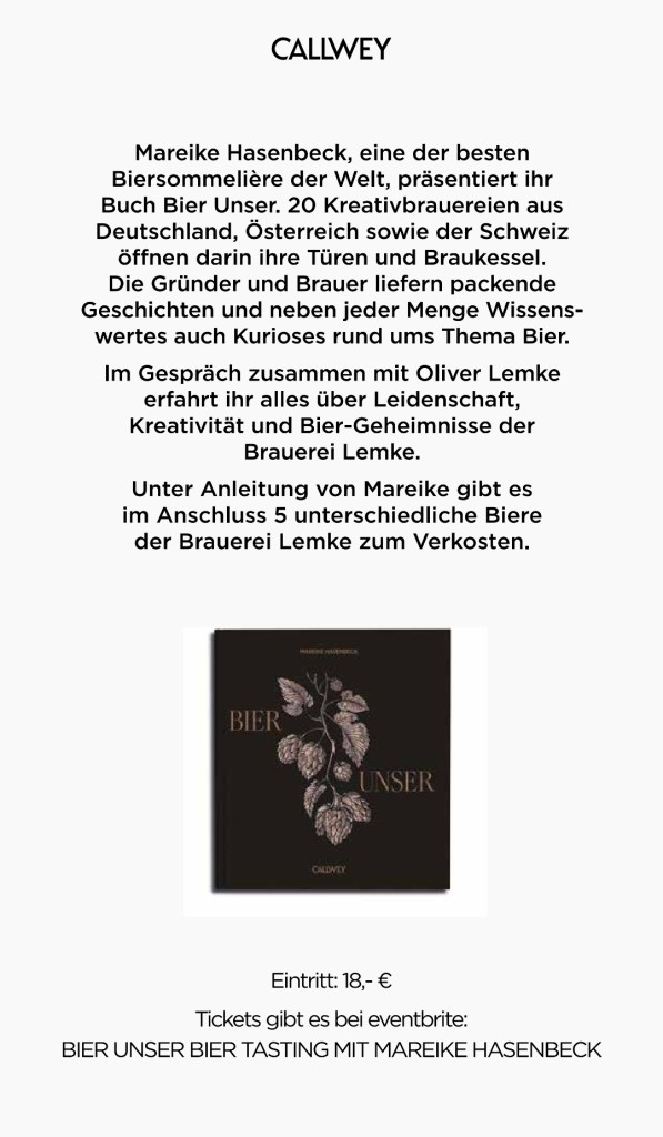 am 24. April komme ich nach Berlin und möchte ich euch gern mein Buch „Bier Unser“ vorstellen. Habt ihr Lust und Zeit einen tollen Abend bei spannenden Bieren mit mir zu verbringen? Oliver Lemke von der Brauerei Lemke ist auch dabei. Im Gespräch erzählen wir euch etwas über die Leidenschaft zum Bier, Kuriositäten im Braukosmos und verraten echte Biergeheimnisse. Ich würde mich sehr freuen, wenn ihr vorbei kommt und wir mit der ein oder anderen Spezialität anstoßen.
