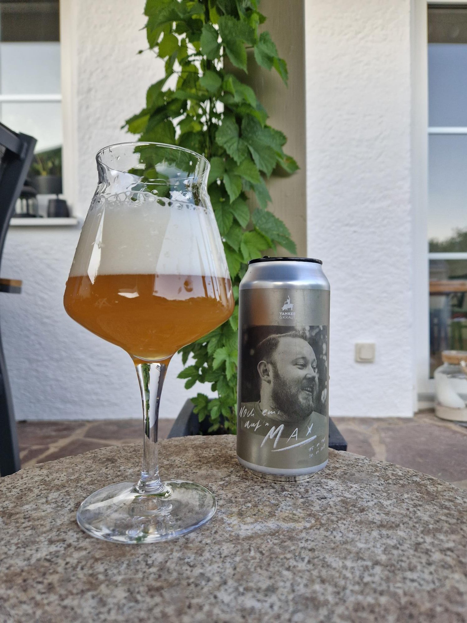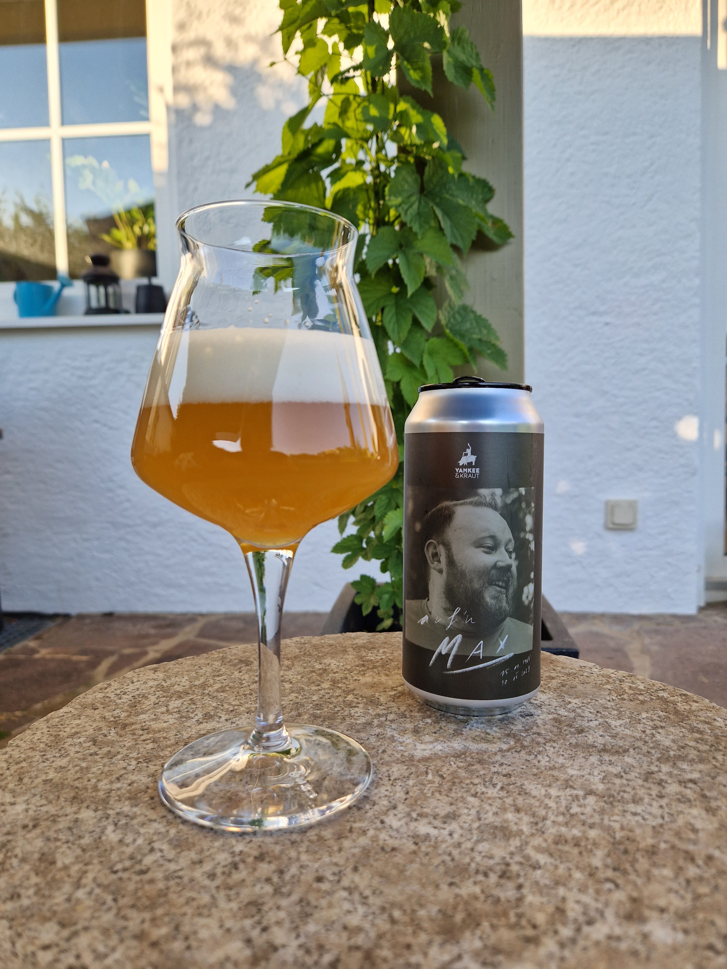 Bei beiden Sorten handelt es sich um die Lieblingsbierstile von Max. Das Double NEIPA mit kräftigen 8,3 Umdrehungen hopfte der Yankee mit Idaho 7 Cryo, Amarillo Cryo und Cascade Cryo. In einem leuchtenden, trüben Gelborange fließt die Hopfenbombe ins Glas. Getoppt ist sie von einem weißen, feinporigen Schaum. In die Nase strömen saftige Noten von gelben Steinfrüchten, Mango, Zitrus, Maracuja und Ananas. Auf der Zunge zeigt sich das Max-Bier cremig-weich und breitet sich herrlich vollmundig aus. Im Aroma dringen auch die fruchtigen Hopfennoten durch. Hinzu kommen eine sanfte Würzigkeit und eine schmeichelnde Bittere, die sich im langanhaltenden, aromatischen Finish präsentiert. Hier ist Vorsicht geboten. Das Bier ist trotz der vorgegebenen acht Prozent sehr süffig und wäre auch für Max eine besondere Herausforderung gewesen, der solche kräftigem Hopfenbomben liebte.