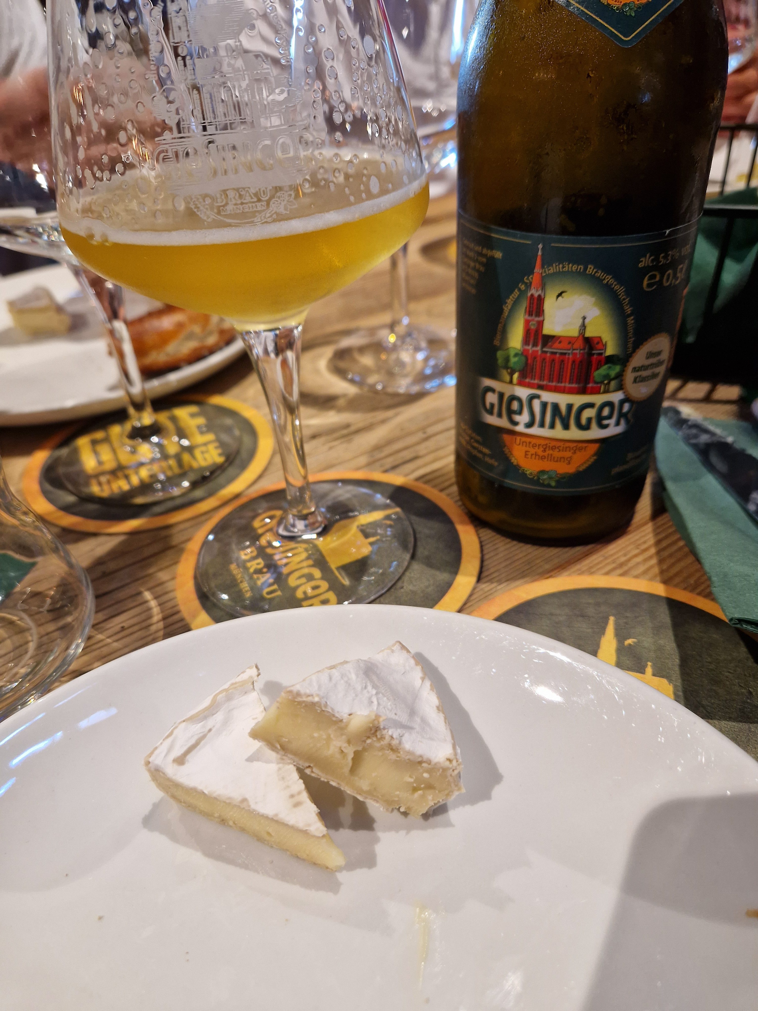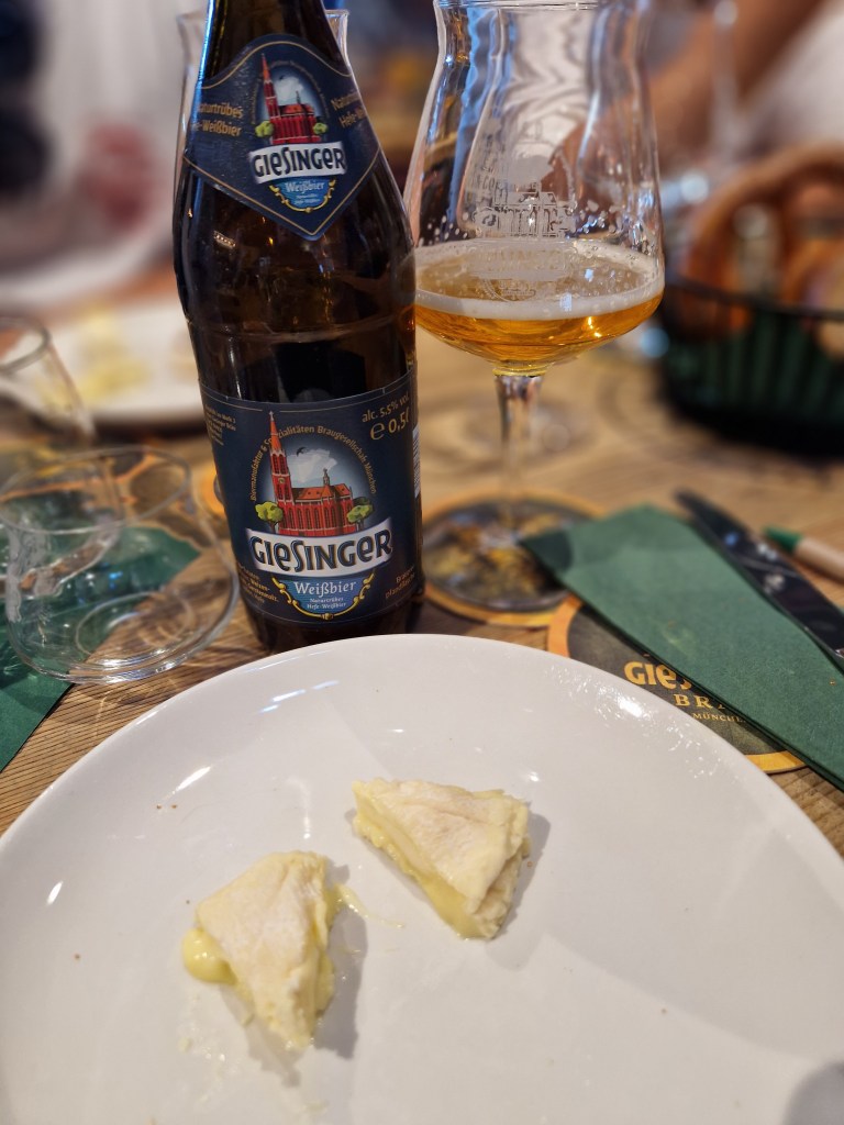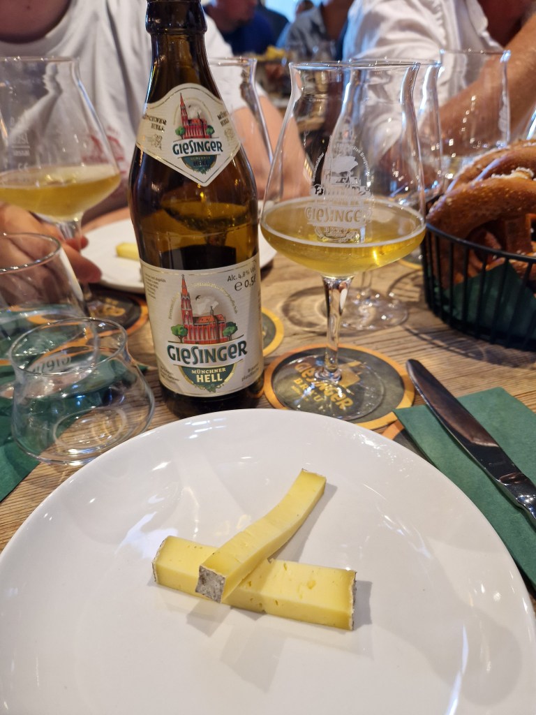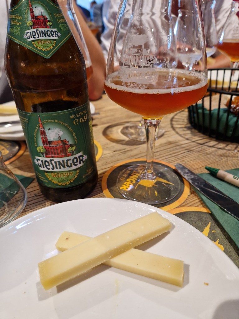Los ging’s mit dem „Mühlistein“ aus der Schweiz – ein junger Schnittkäse aus Rohmilch mit gräulicher Rinde, cremigem Kern, goldgelbem Teig und Bruchlöchern. Das Aroma zeigte sich mild-säuerlich. Dazu reichte das Giesinger-Team das Helle. Die Süße des Bieres und die Cremigkeit des Käses sowie die sanfte Herbe des Hellen und die Würzigkeit vom Mühlistein harmonisierten unaufdringlich miteinander. Guter Start!
