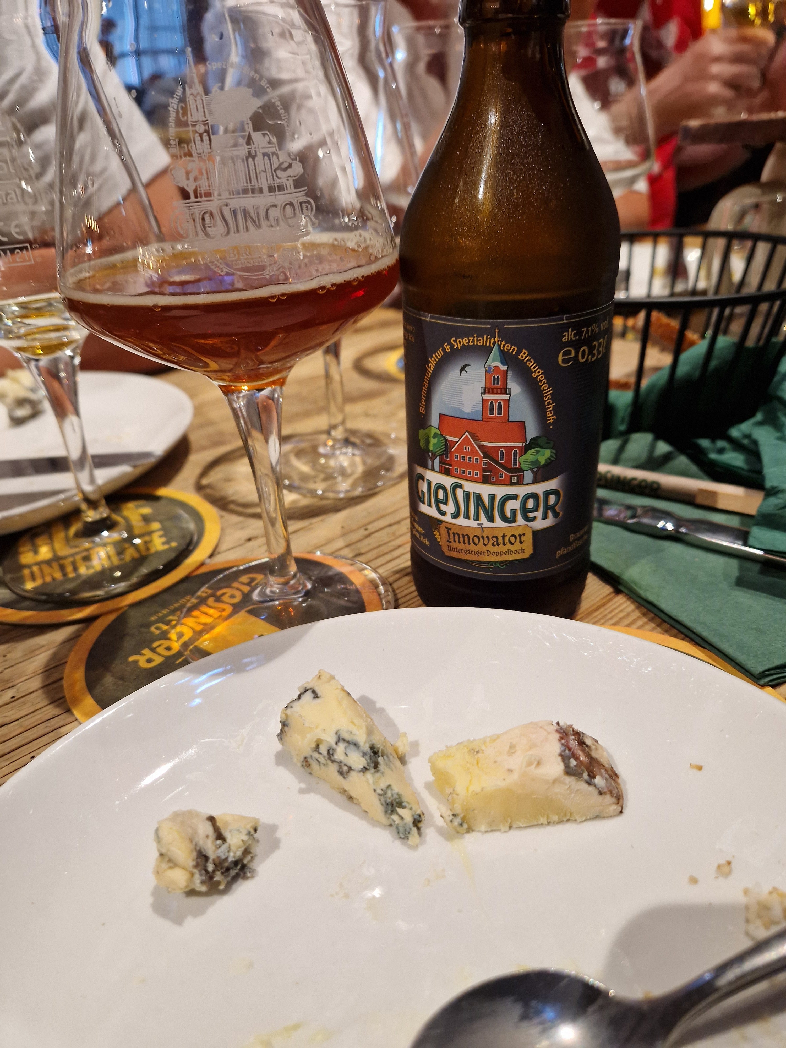 Beim letzten Paar handelte es sich um einen intensiven Schweizer Blauschimmelkäse und den dunklen Bock „Innovator“ vom Giesinger. Die Kombination war nichts für schwache Geschmacksknospen. Sie war sehr intensiv, cremig, pikant, würzig, süßlich mit Umami-Flair. Sehr spannend, aber hier hätte der Käse tatsächlich ein noch kräftigeres Bier vertragen können.