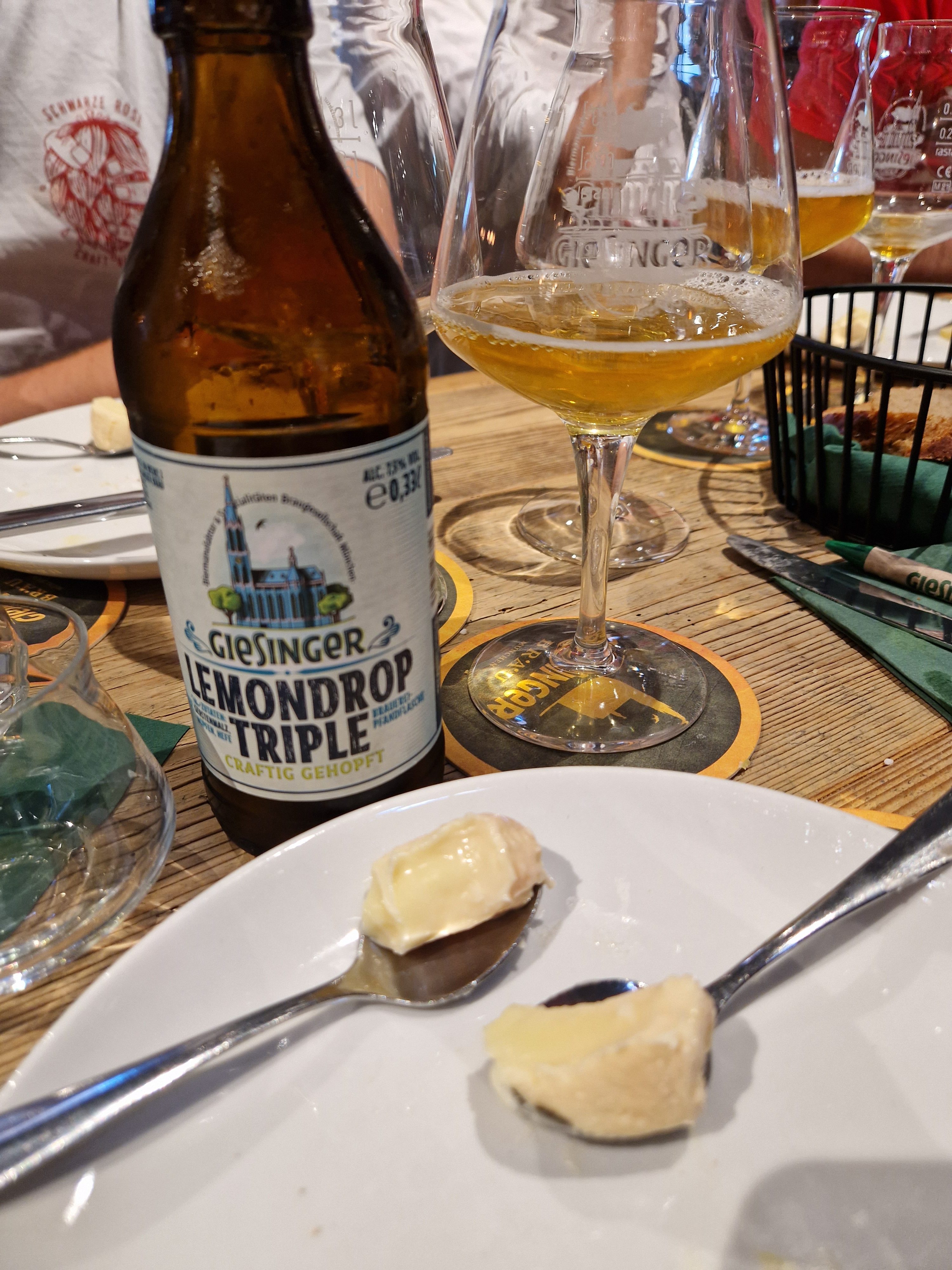 Zum Abschluss kamen noch zwei Kombinationen, bei denen einige Teilnehmer schon etwas überfordert waren. Das „Lemondrop Triple“ wurde zum „Isarbatzi“ gereicht, also ein 7,5-prozentig, belgisch-angehauchtes Bier mit Lemondrop-Hopfen zu einem acht Wochen gereiftem Weichkäse aus Rohmilch. Hier trafen zwei aromastarke Produkte aufeinander, die zitrusartige Noten vom Hopfen und eine leichte Alkoholschärfe des Bieres und dann eine cremig-würzige, umamiartige, sehr intensive Melange vorlegten. Gefiel mir.