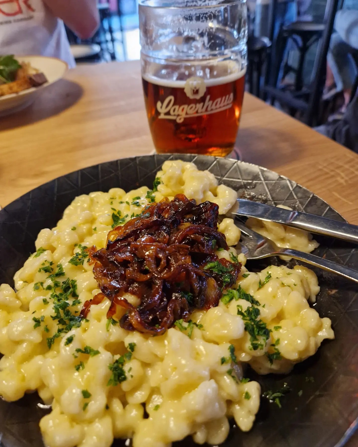 Das „Lagerhaus“ soll zwar eine trinkbetonte Location sein, die aber auch vernünftige Speisen auf den Teller bringt. Auf der Karte stehen bayerische, fränkische und Tiroler Klassiker wie Brotzeit, Käsespätzle, Dunkelbiergulasch oder Bratwürste mit Sauerkraut. Bis zu den selbst eingelegten Essiggurken ist alles hausgemacht oder kommt von regionalen Produzenten.