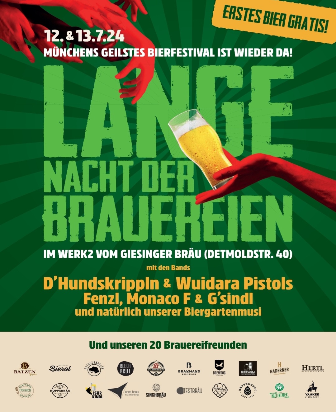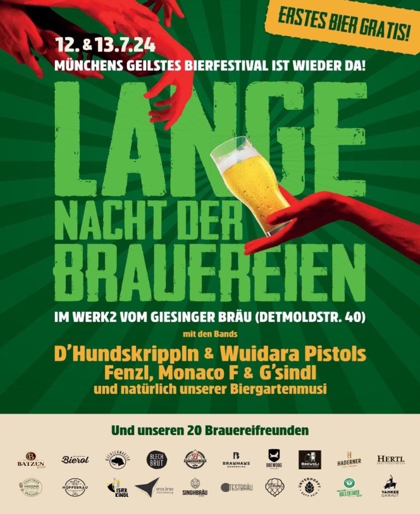 Giesinger Bräu aus München ist nicht nur bekannt für Crowdfunding-Aktionen, kreative Ideen und gutes Bier. Das Team um Gründer und Chef Steffen Marx veranstaltet auch seither grandiose Bier- und Brauereifeste. So findet am 12. und 13. Juli wieder die „Lange Nacht der Brauereien“ im Werk 2 statt. Bier gibt es aber nicht nur vom Gastgeber, sondern auch von Hoppebräu, Yankee & Kraut, Tilmans Biere, Braumanufaktur Hertl, OrcaBrau und vielen mehr. Für das leibliche Wohl ist gesorgt. Die Stimmung heizen verschiedenen Bands wie D’Hundskrippln & Wuidara Pistols, G’sindl oder aber die Biergarten-Musik ein.