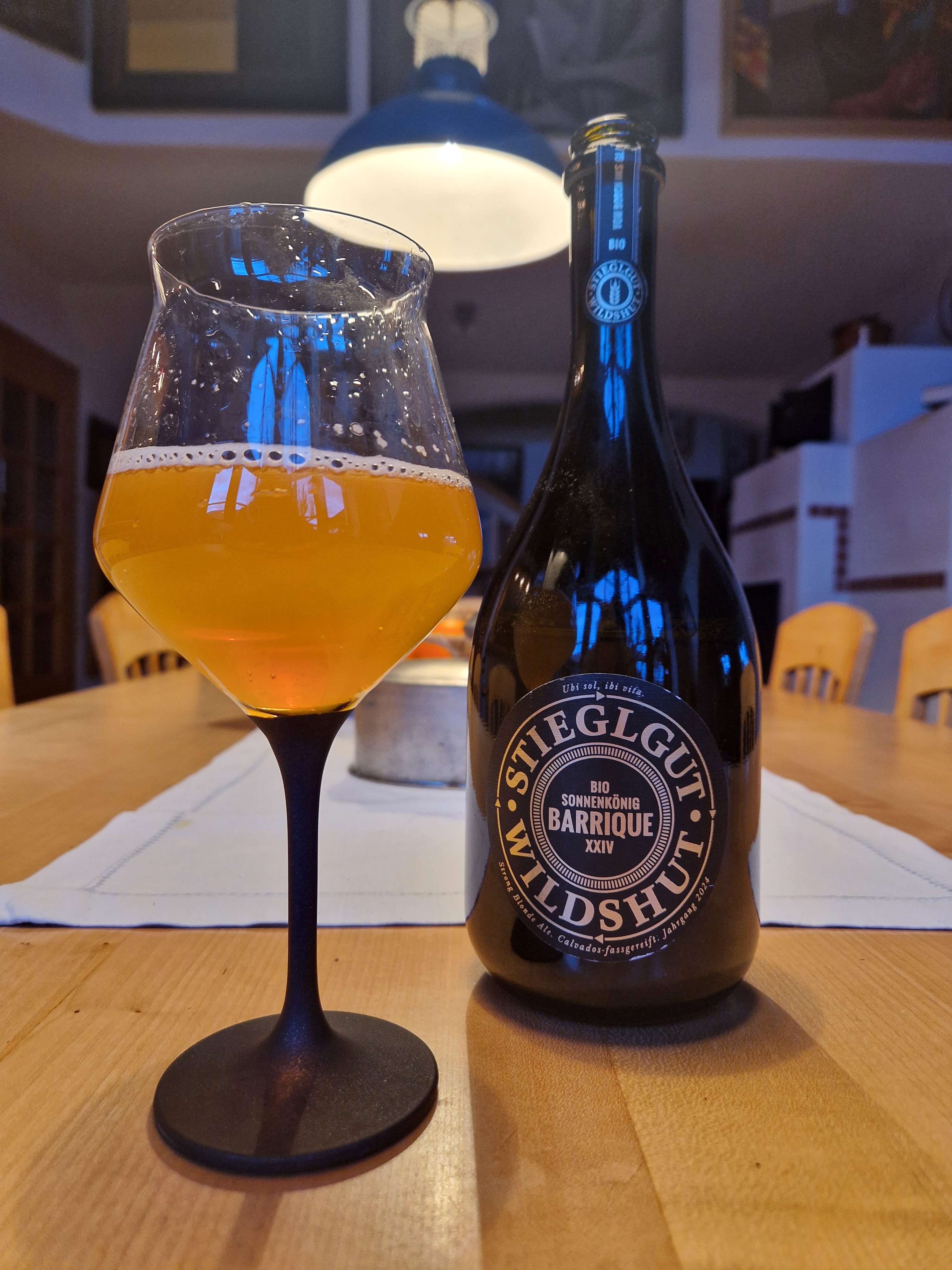 Das Stiegl-Gut Wildshut nahe Braunau am Inn gelegen, steht für besondere Biererlebnisse. Neben einem Frischebier-Sortiment und einem Brut de Biére mit Hefe aus der Champagne konzentriert sich das Brauteam um Markus Trinker seit 2022 auch auf spezielle fassgereifte Jahrgangseditionen. Kürzlich konnte ich das 13,6-prozentige Schwergewicht aus dem vergangenen Jahr namens „Sonnenkönig 2024 Barrique XXIV“ verkosten. Dabei handelt es sich um ein Strong Blonde Ale, gebraut mit Bio-Pilsnermalz aus der eigenen Mälzerei, Bio-Aromahopfen und Wasser aus der hauseigenen Quelle, das zur Vollendung sechs Monate in Calvados-Fässern reifte.